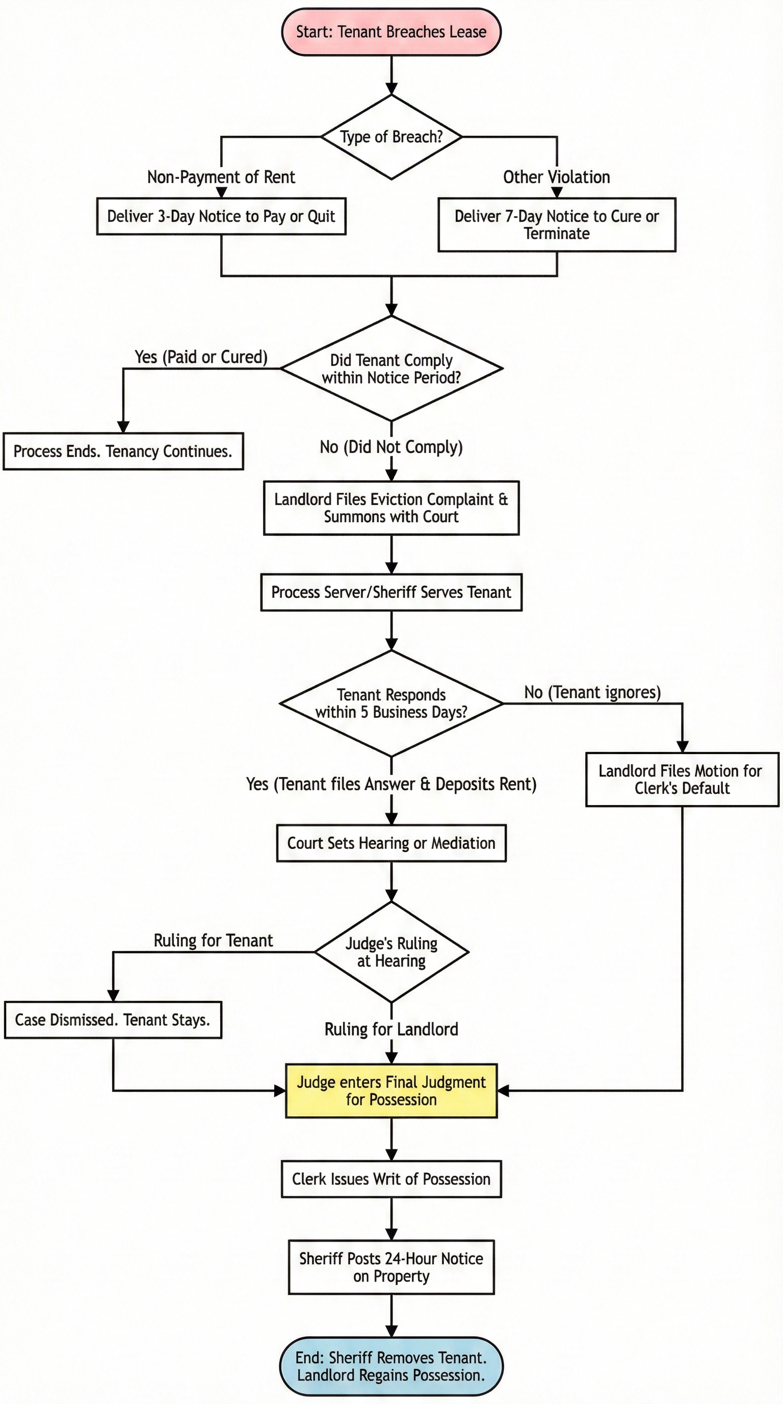 The eviction lawsuit begins with the filing of a complaint with the court. The complaint is a legal document that sets forth the facts of the case and the relief that is being sought. The complaint must be served on the tenant, who will then have an opportunity to respond.