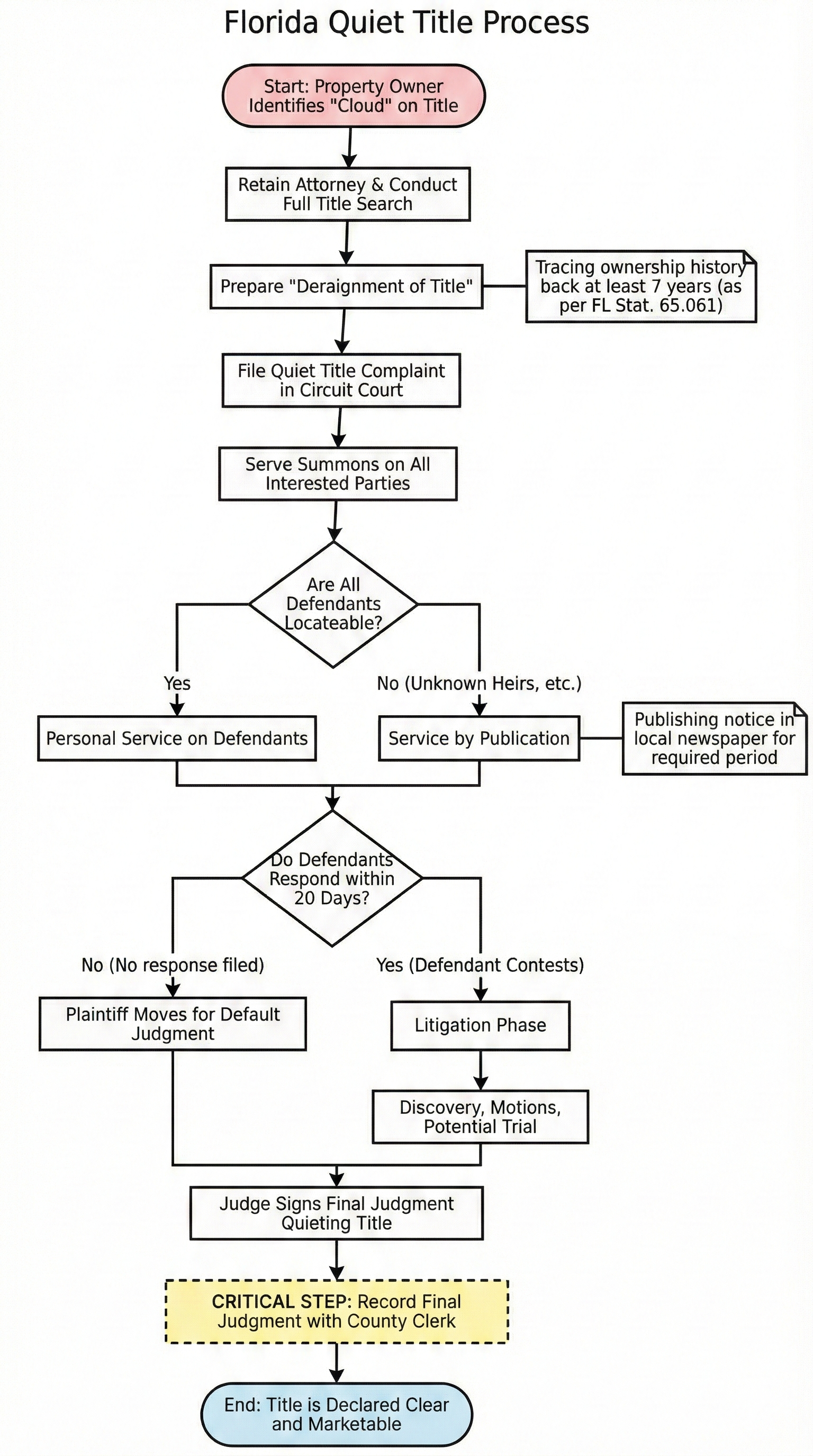 The quiet title process in Florida is a judicial proceeding that involves filing a lawsuit with the court. The process can be complex and time-consuming, but it is the only way to obtain a court order that definitively establishes your ownership of a property. A Florida quiet title attorney can guide you through each step of the process.